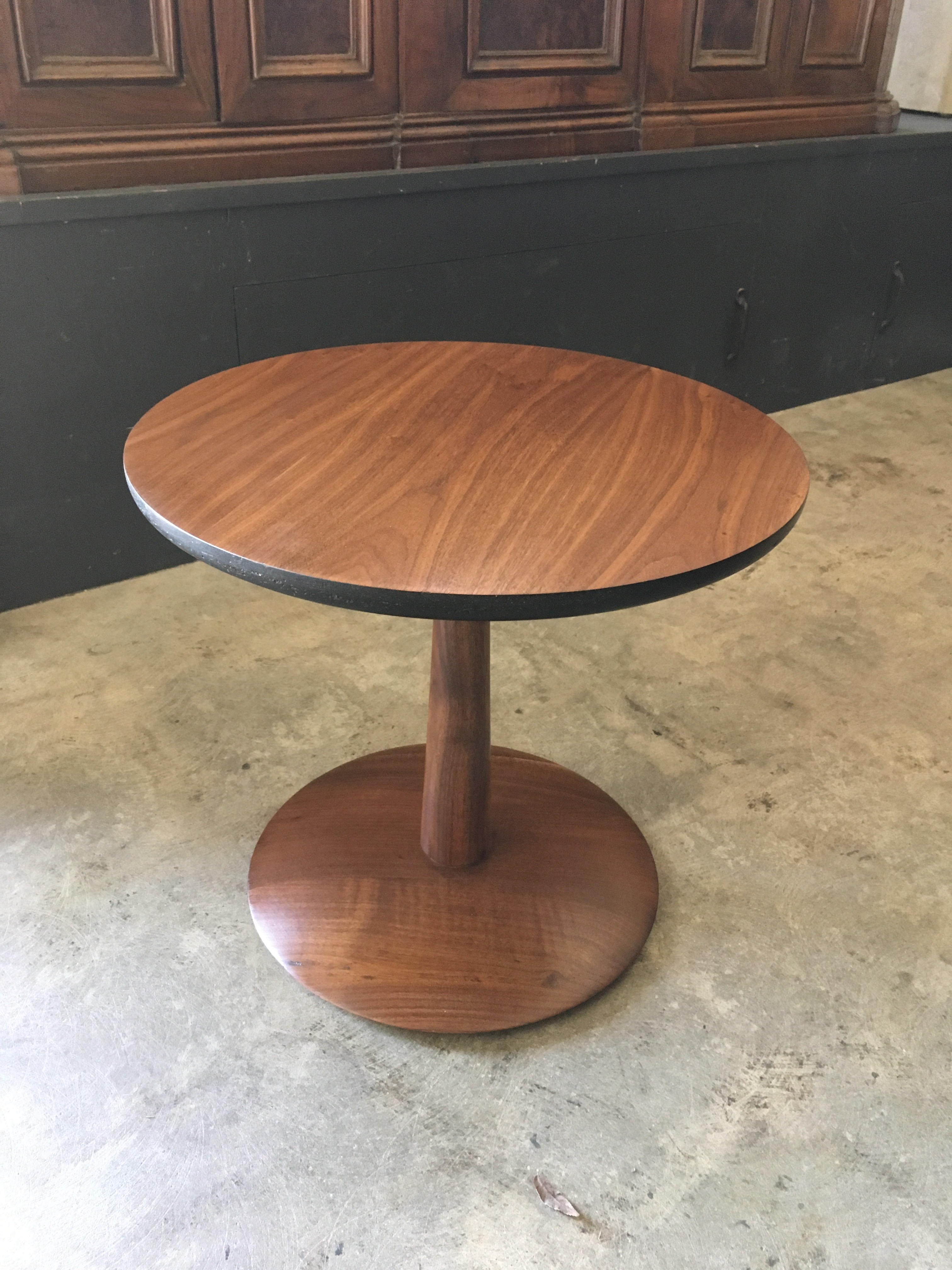This is round, wooden top and metal coffee table.it is a modern and sleek design that will compliment any living room.